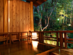 貸切露天風呂では、目の前に広がるみずみずしい木々の緑と水の流れを全身で感じながら、