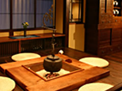 古い板張りの廊下を行くと、囲炉裏があります。夏場を除き、いつも炭火ががおきていて、