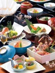 日本料理の会席です。食事処から見える月を眺めながら頂くという趣旨でご用意しました。季節ごとの地産の新鮮な食材はもちろん、ご来館頂いた方々から評判の料理も盛り合わせていますので宿泊者、地元の方々両方共に喜んで頂いています。 |