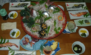 宿泊の翌日はたまたま志摩町の「あわび王国祭り」が近隣の和具漁港で開催されており、まぐろやかつお等の刺身をいっぱい食べられる「漁船盛り」(1人200円)や魚のつかみ取りなどのイベントやあわび・伊勢海老の販売店などが多数出店され、多くの人で賑わっていました。宿に泊まった人には抽選会でサザエが貰え、私もラッキーなことに大きなサザエ9個が当たり、家でサザエのつぼ焼きを堪能しました。 |